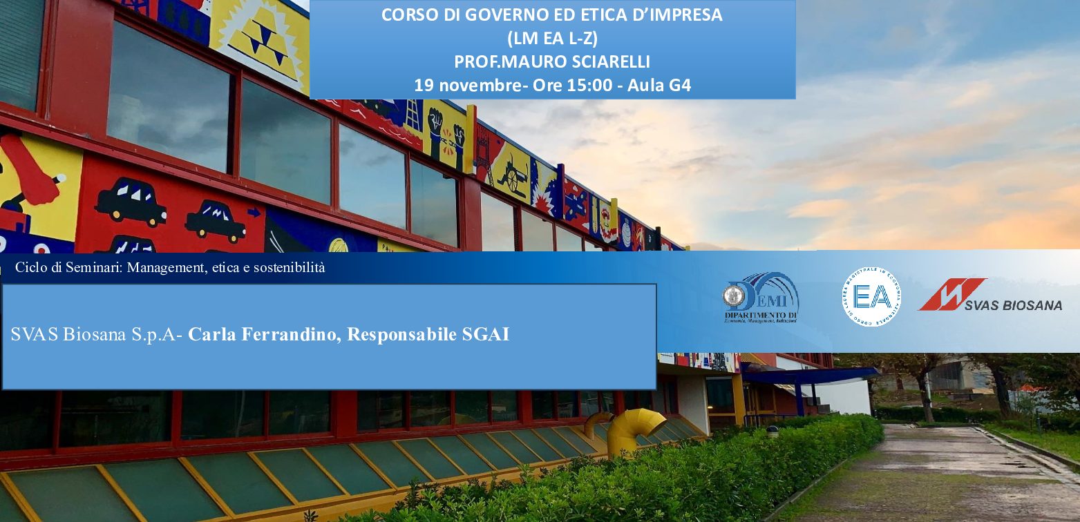 “Il Dipartimento è lieto di aver ospitato, nell’ambito del corso del Prof. Mauro Sciarelli, la Dott.ssa Carla Ferrandino (Responsabile SGAI SVAS Biosana Spa), che ha portato agli studenti una testimonianza di grande valore sui temi della sostenibilità, della responsabilità sociale e dei sistemi di gestione integrata in ambito aziendale.